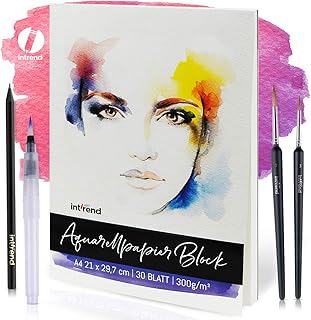 int!rend Aquarellpapier, 300 g, DIN A4, 30 Blatt, Weiß, geleimt, Aquarellblock, Watercolour Paper Pad, inkl. Wassertankpinsel, zwei Pinsel, Bleistift - Malblock Papier für Aquarell, Zeichnen, Malen