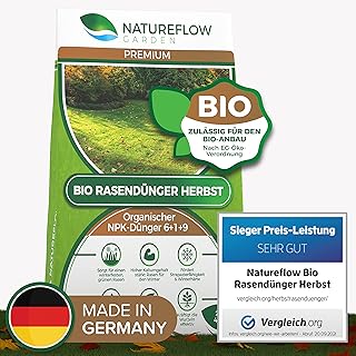 Natureflow Premium Organischer Herbstrasendünger - 12,5kg Bio Rasendünger Herbst für einen Kräftigen, Winterfesten, Gesunden Traumrasen - NPK Dünger 6+1+9 für Strapazierfähigkeit und Winterhärte