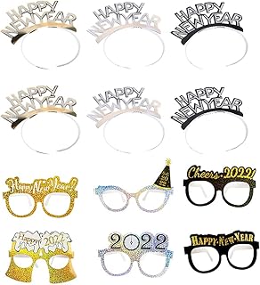 Amosfun 12 Stück 2022 Happy New Year Brille Stirnband Set Fancy New Year Party Brille Lustige Brille Glitzer Haar Tiara für 2022 Silvester Party Dekorationen Party Favor